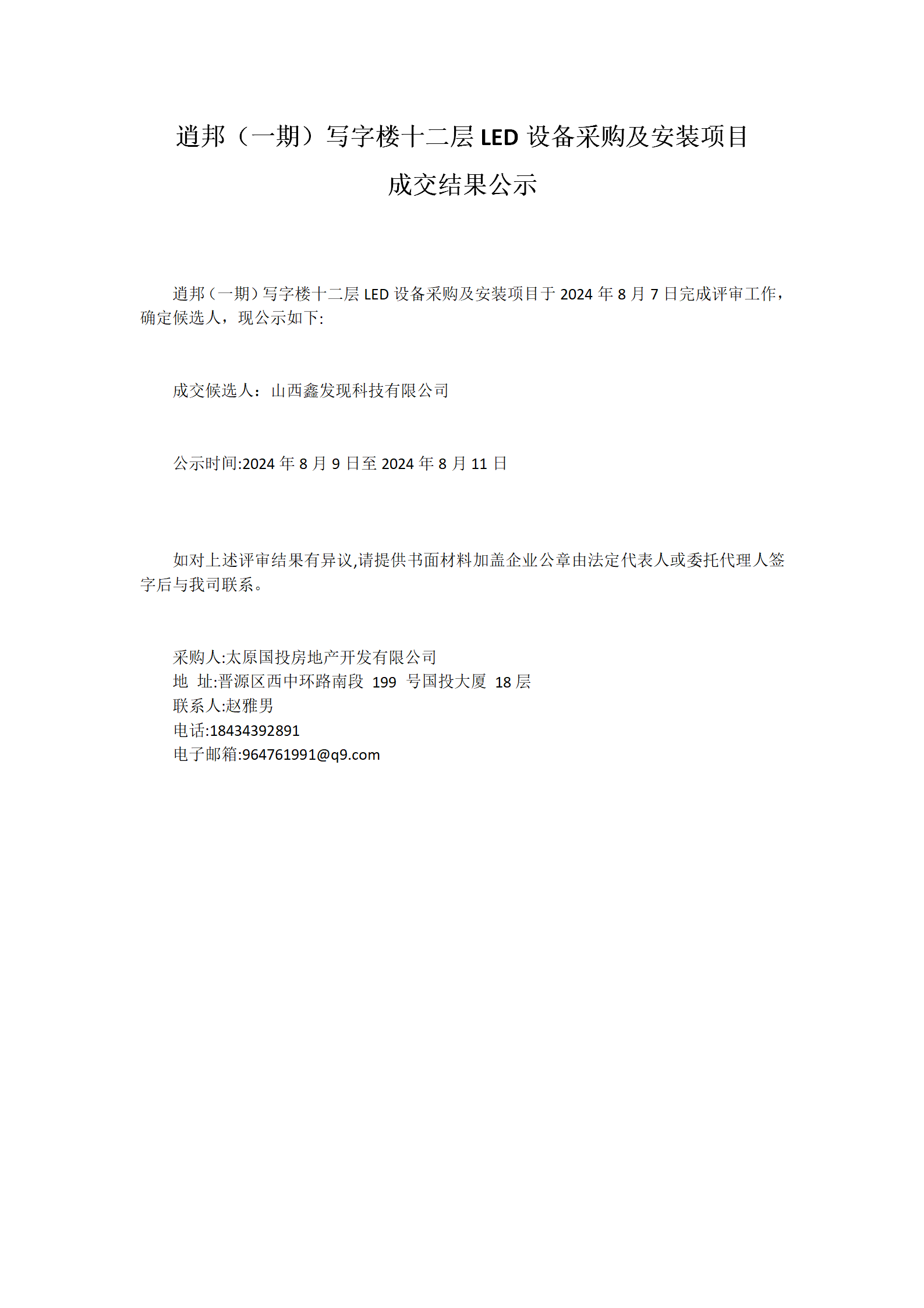 逍邦(一期)寫字樓十二層LED設(shè)備采購及安裝項目成交結(jié)果公示