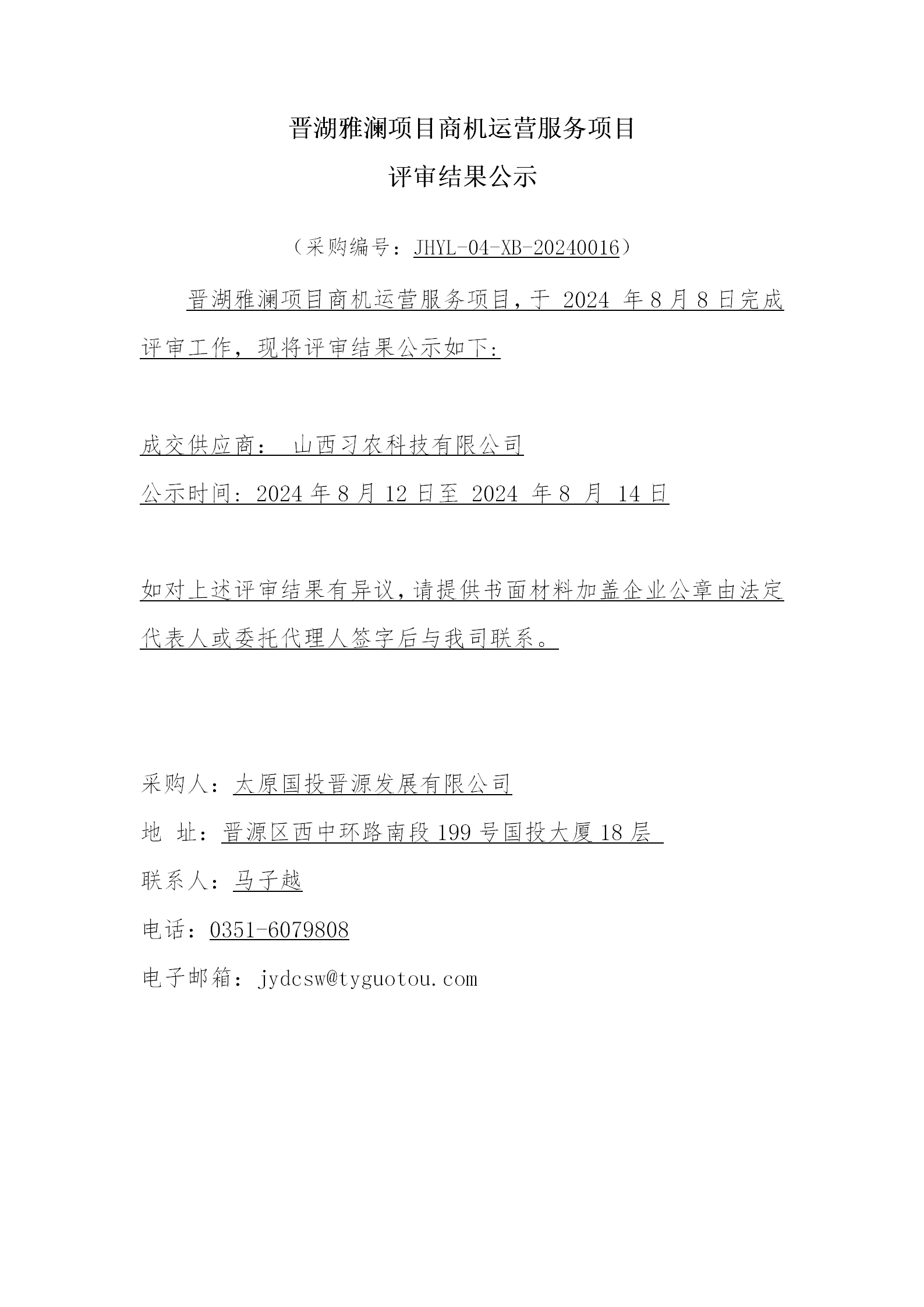 晉湖雅瀾項目商機運營服務項目評審結果公示