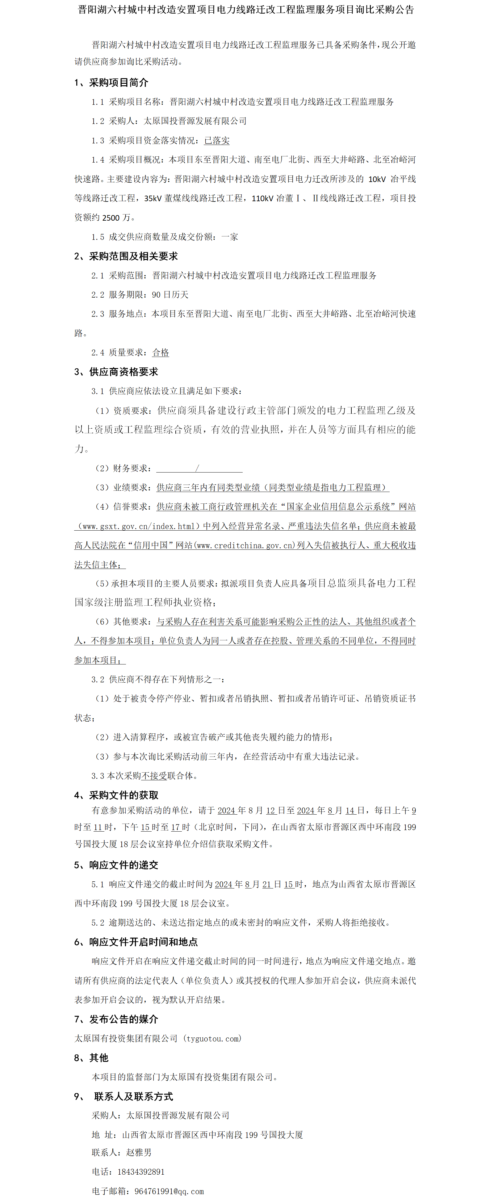 晉陽(yáng)湖六村城中村改造安置項(xiàng)目電力線路遷改工程監(jiān)理服務(wù)項(xiàng)目詢(xún)比采購(gòu)公告