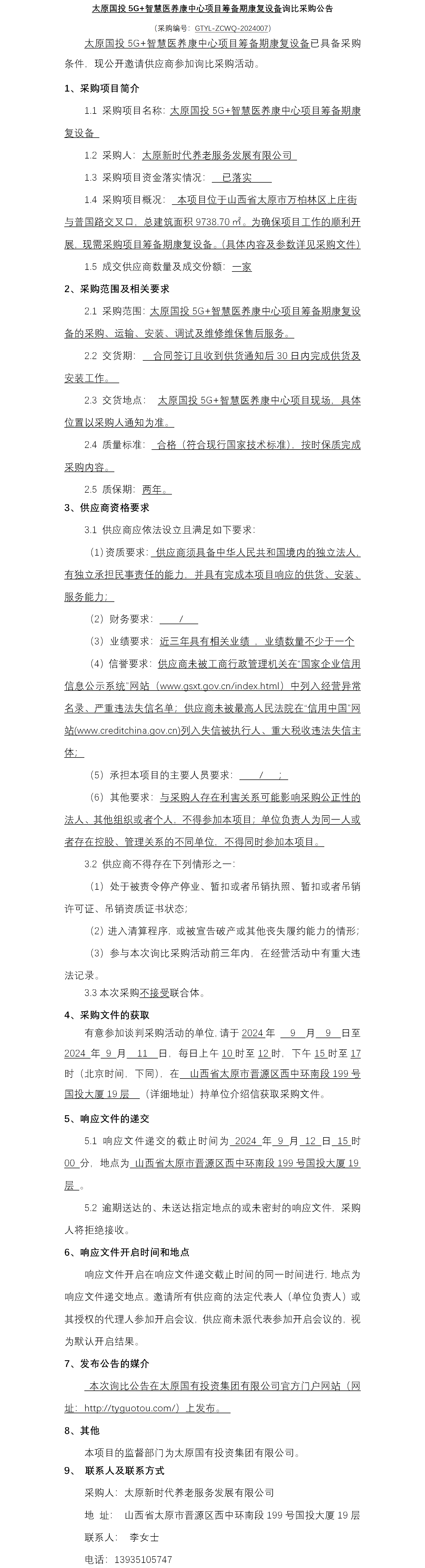 太原國投5G+智慧醫(yī)養(yǎng)康中心項目籌備期康復設備詢比采購公告