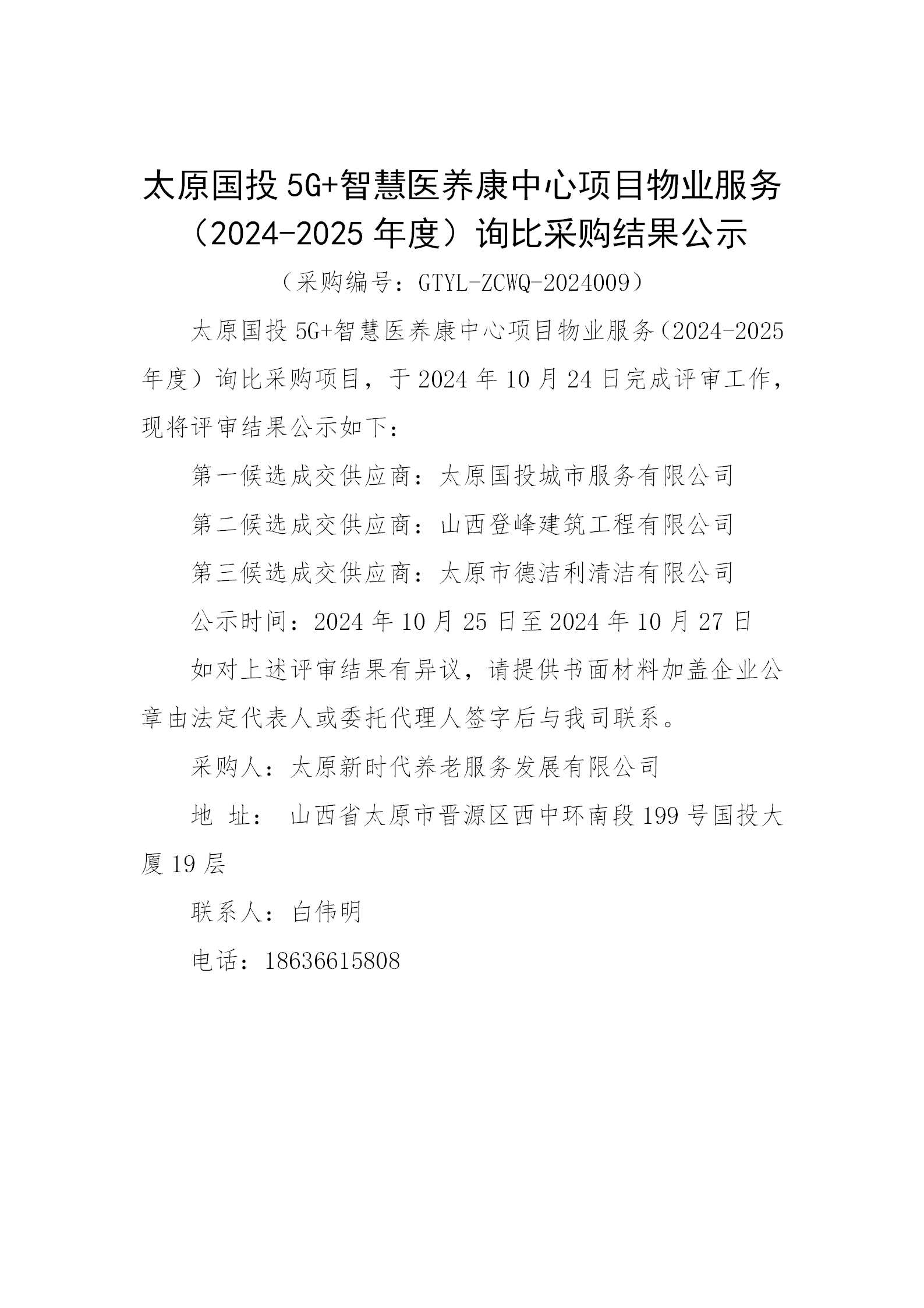 太原國投5G+智慧醫(yī)養(yǎng)康中心項目物業(yè)服務(2024-2025年度)詢比采購結果公示