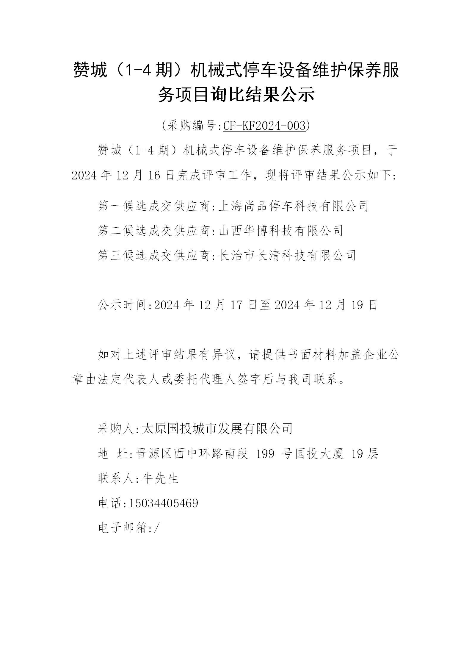 贊城(1-4期)機械式停車設(shè)備維護保養(yǎng)服務(wù)項目詢比結(jié)果公示