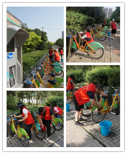 活動(dòng)當(dāng)天,志愿者們分工合作、職責(zé)明確,一部分志愿者將營銷中心周邊一公里內(nèi)公交自行車站點(diǎn)停車樁、公共自行車清潔擦拭,一部分志愿者將附近隨意停放的共享單車安置于統(tǒng)一位置并進(jìn)行清潔。經(jīng)過一個(gè)多小時(shí)的共同努力,停車樁及公共自行車閃亮如新,一排排整齊、有序的共享單車擺放路旁。